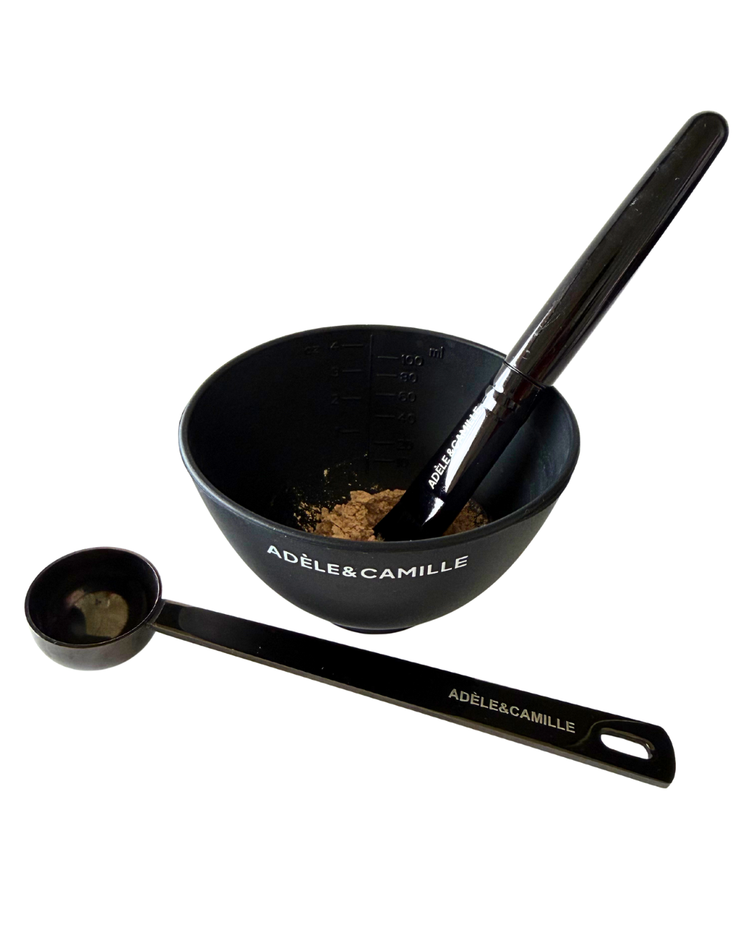 2. Everything else you need for a perfect mask ritual: mixing bowl, application brush, konjac sponge, measuring spoon, travel bag