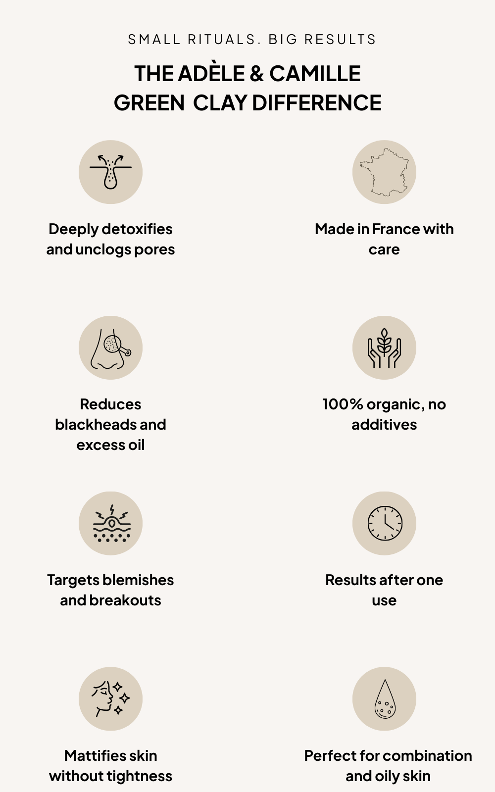 Formulated with 100% French green and volcanic clays, Clay de Détox goes beyond surface-level cleansing. It helps rebalance sebum production, purify pores, and gently refine skin texture without over-drying. Unlike harsher detox masks, ours respects your skin’s microbiome — leaving it fresh, never stripped. Ideal for acne-prone, combination, or city-stressed skin in need of a deep reset. Use once or twice a week to maintain that clean, clear feeling.